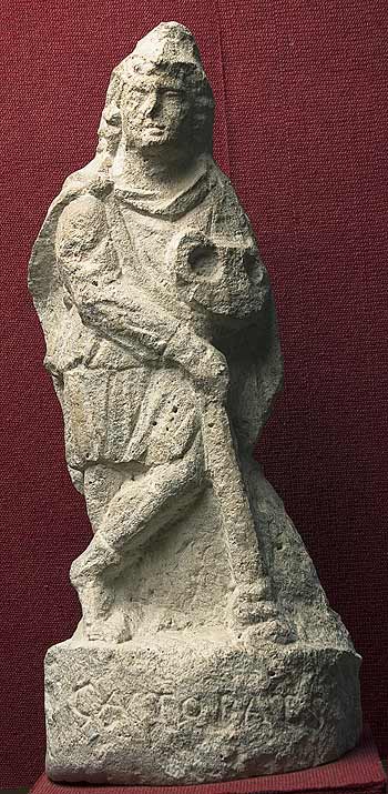- Mythische Figur (Cautopates) : mit überkreuzten Beinen stehender Jüngling mit langen Locken, phrygischer Mütze, Mantel, Ärmeltunica und Hosen, auf gesenkte Fackel gestützt.