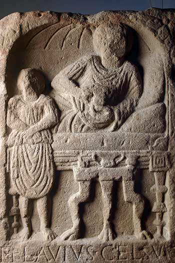 - Totenmahl : in Muschelnische auf Kline gelagerter Mann in Tunica und Mantel, in der Rechten Trinkgefäß. Vorn dreibeiniger Tisch mit Löwenfüßen, darauf drei Gefäße. Vor dem Fußende der Kline stehender Diener in kurzer, gegürteter Tunica. In den Zwickeln über dem Muschelbogen Rosetten.