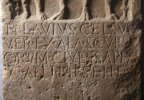 - T(itus) Flavius Celsu[s] / vet(e)r(anus) ex ala Scubu[l]/orum cives(!) Sappa/us ann(orum) L h(ic) s(itus) e(st) h(eres) f(aciendum) [c(uravit)]