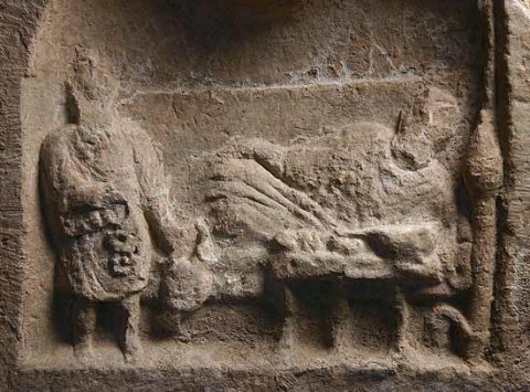 - Totenmahl : in Muschelnische auf Kline gelagerter Mann in Tunica und Mantel. in der Linken große Trinkschale. Vor ihm dreibeiniges Tischchen mit Gefäßen, links stehender Diener in kurzer Ärmeltunica, in der Linken Krug. Rechts senkrecht aufgestellte Lanze (?).