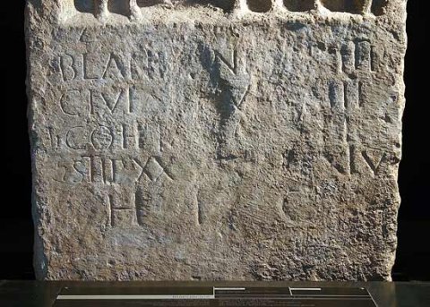 - Blan[---]an[---]itu[s?] / cive[s ---]V[---]II[---] / coh(ortis) I[---]I[---] / stip(endiorum) XX[---] IV / h(eres) f(aciendum) c(uravit)