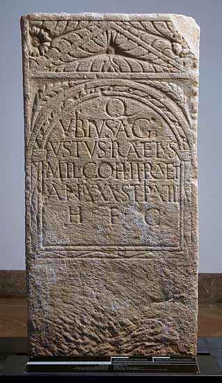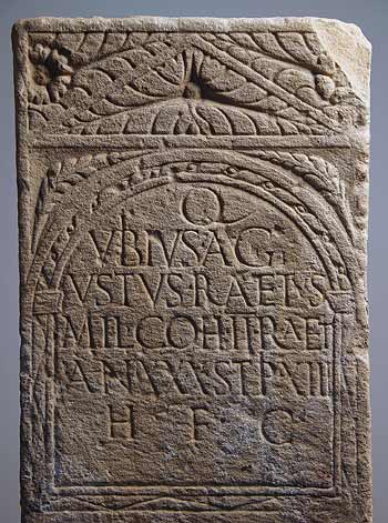 - Q(uintus) / Vibius A(u)g/ustus Raetus / mil(es) coh(ortis) II Raet(orum) / an(norum) XXX stip(endiorum) XIII / h(eres) f(aciendum) c(uravit)