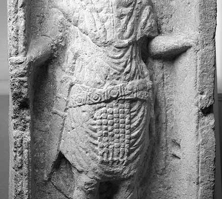 - In Muschelnische stehende Ganzfigur eines Soldaten in kurzer Tunica und zurückgeschlagener Paenula, Gürtel mit Beschlägen. Waffen: Streifenschurz, an der rechten Hüfte Schwert (gladius), an der linken Dolch. In der Rechten zwei Speere, die Linke liegt auf dem Rechteckschild. In den Zwickeln über dem Bogen Rosetten und Blätter.