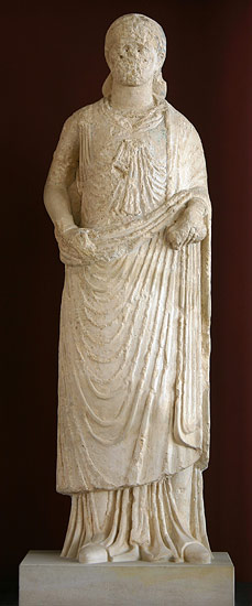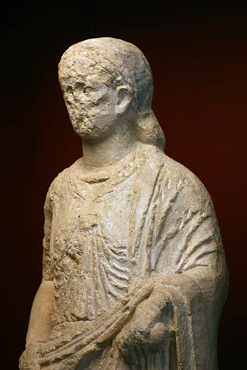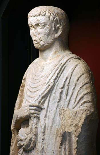 - Zwei Statuen (Ehepaar). Mann: bartloser Togatus. Einheimische Frau: Haube, Mantel, Kleid mit Fibeln, Halsring, Reif um den rechten Oberarm. In der Linken Rocken ?
