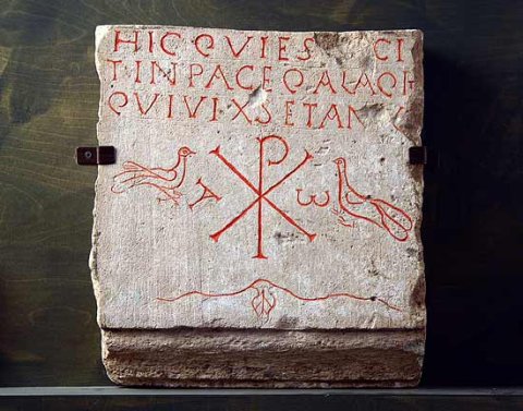 - unterhalb der Inschrift zwei Tauben seitlich eines Christogramms mit Alpha und Omega (Ritzzeichnung)
