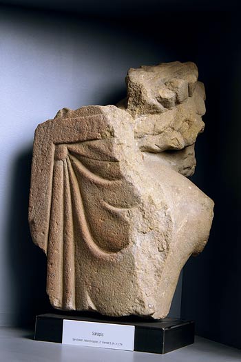 - Mythische Figur (Serapis ?, Jupiter ?) : bärtiger Kopf mit langen Locken und Kranz aus senkrechten Blättern, Oberkörper nackt bis auf Mantelbausch auf der linken Schulter. Im Rahmen der Rückenlehne ist ein Tuch befestigt.