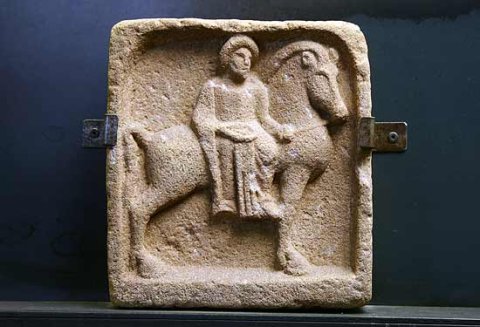 - Mythische Figur (Epona) : nach rechts gehendes Pferd, darauf frontal sitzende Frau in langem Gewand und Mantel, die Rechte hält Schale, die Linke den Zügel.