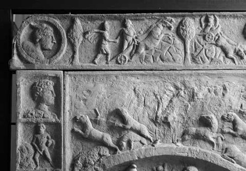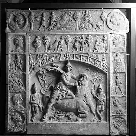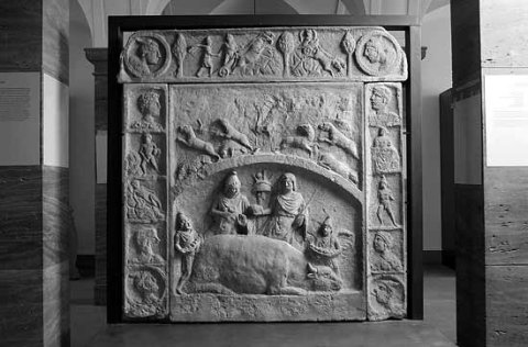 Vorderseite : im Zentrum Stiertötung (Tauroktonie) unter einem flachen Bogen mit Tierkreiszeichen. In den Zwickeln darüber Mithras als Bogenschütze. Im Bildstreifen darüber stiertragender Mithras, Mithras krönt Sol, Mithras reicht kniendem Sol die Hand. Im obersten Bildstreifen seitlich Medaillons mit Büsten von Windgöttern, dazwischen Himmelfahrt von Sol und Mithras und abwärts fahrende Luna. Seitliche Bildstreifen: unten Medaillons mit Windgöttern, darüber je vier Bildfelder mit Szenen der Mithraslegende zwischen Büsten der Jahreszeiten.
