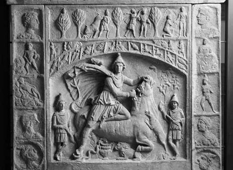 Rückseite der drehbaren Mittelplatte : Mithras und Sol hinter dem toten Stier, rechts und links Cautes und Cautopates. Im Bildfeld darüber in der Mitte Reste einer ausschreitenden Gestalt zwischen jagenden Löwen.