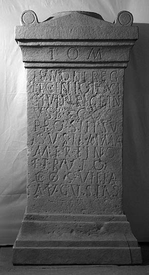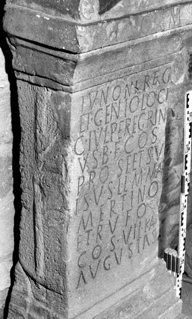 - [I(ovi) O(ptimo) M(aximo)] / Iunoni R[eg(inae)] / et Genio loc[i] / C(aius) Iul(ius) Peregr[in]/us b(ene)f(iciarius) co(n)[s(ularis)] / pro se et s[u]/is v(otum) s(olvit) l(ibens) l(aetus) m(erito) M[a]/mertin[o] / et Rufo / co(n)s(ulibus) VII Ka[l(endas)] / Augustas