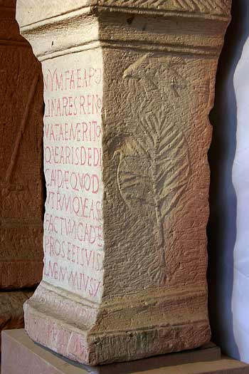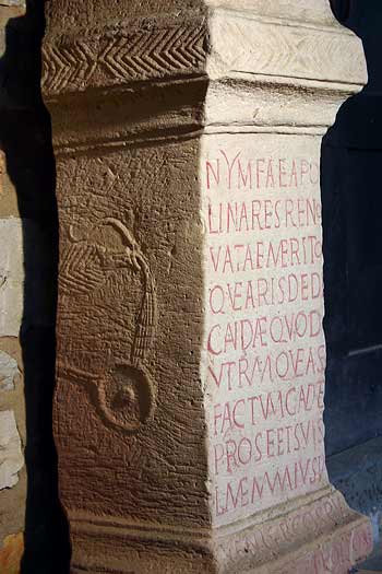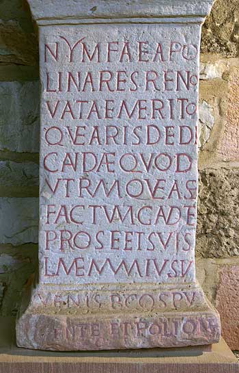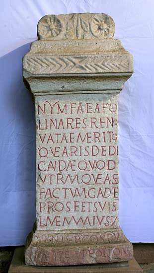 - Nymfae Apol/linares reno/vatae merito/que aris dedi/candae quod / utrumque a se / factum gaudet / pro se et suis / L(ucius) Memmius Iu//venis b(eneficiarius) co(n)s(ularis) Pu//dente et Pol(l)ione / co(n)s(ulibus)