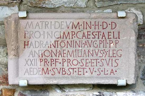 - [Matri De]um in h(onorem) d(omus) d(ivinae) / pr[o in]c(olumitate) Imp(eratoris) Caes(aris) T(iti) Aeli / H[adr(iani)] Antonini Aug(usti) Pii p(atris) p(atriae) / [- An]ton(inus) Aemilianus |(centurio) leg(ionis) / [XXII] Pr(imigeniae) p(iae) f(idelis) pro se et suis / [aede]m subst(ravit?) et v(otum) s(olvit) l(ibens) a(nimo)