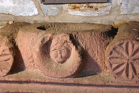 Volutenpolster (pulvini) mit Rosetten, dazwischen Medaillon mit weiblichem (?) Kopf.