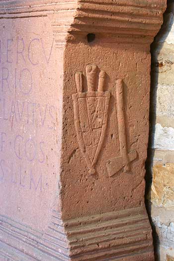 Auf den Nebenseiten Gefäße und Werkzeug. Links Krug und Opferschale (patera), rechts Beil und Opfermesser.