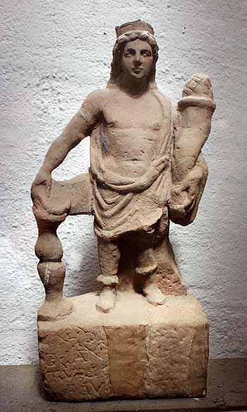 - Mythische Figur (Genius): auf kubischem Sockel stehender Jüngling mit langen Locken, Mauerkrone, Mantel um Hüften und linke Schulter, Stiefeln. Mit der Rechten gießt er eine Schale über einem balusterförmigen Altar aus, im linken Arm Füllhorn mit Pinienzapfen.