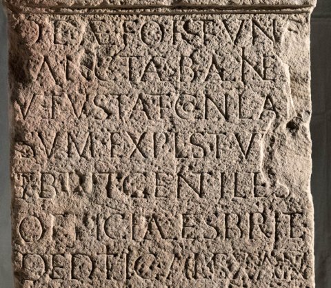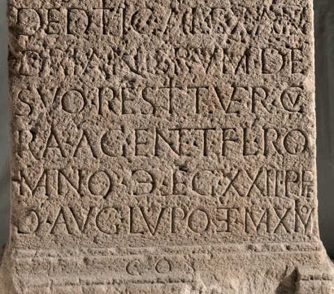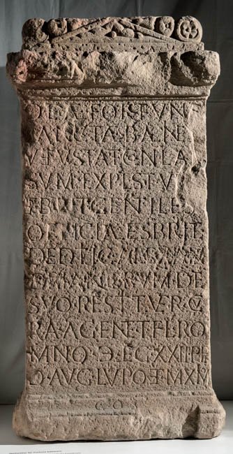 - Deae Fortunae / sanctae balineu[m] / vetustate conlap/sum expl(oratores) Stu[ri] / et Brit(tones) gentiles [et] / officiales Brit(---)(?) / deditic(iorum) [[Alexan]]/[[drianorum]] de / suo restituer(unt) cu/ra(m) agente T(ito) Fl(avio) Ro/mano |(centurione) leg(ionis) XXII P(rimigeniae) p(iae) f(idelis) / Id(ibus) Aug(ustis) Lupo et Maximo // co(n)s(ulibus)