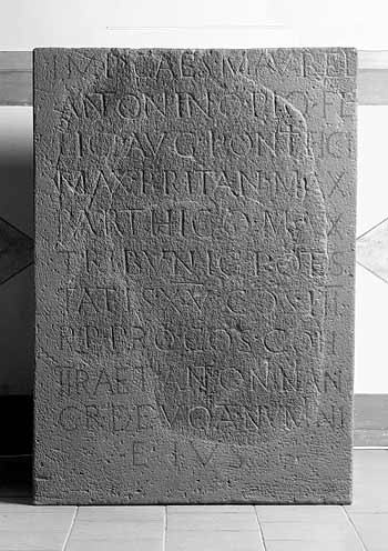 - [ Im]p(eratori) Caes(ari) M(arco) Aurel(io) / Antonino pio [ fe]/lici Aug(usto) pontif[ici] / max(imo) Britan(nico) ma[x(imo) ] / Parthico ma[x(imo) ] / [ t]ribunic(ia) pote[s]/tate XV co(n)s(uli) I[II] / p(atri) p(atriae) proco(n)s(uli) coh(ors) / [ Raet(orum) ] Antoninia[na] / [ c(ivium) R(omanorum) ] d[e]vota numin[i] ei[u]s