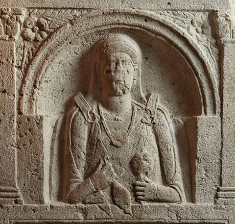 - Einheimische Frau. In Bogennische zwischen Pilastern Brustbild vor Sessellehne: Haube, Schleier, Unter- und Obergewand, Flügelfibeln, Brosche, Kette mit Medaillon, in den Händen Spindel und Rocken. Über dem Bogen Zwickelrosetten.