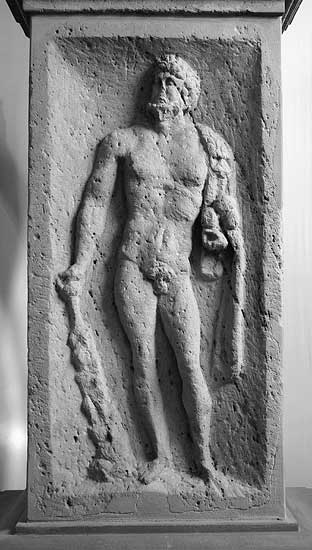 Auf der Rückseite stehender nackter bärtiger Hercules, Löwenfell über dem linken Arm, die Rechte auf Keule gestützt. - Inschrift