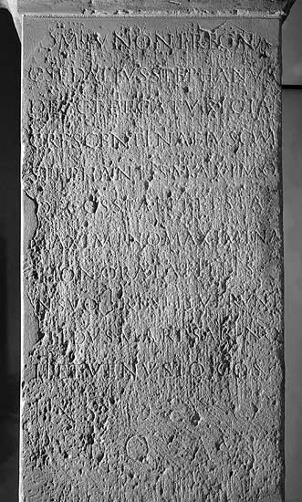 - [I(ovi)] O(ptimo) M(aximo) Iunoni Reginae / C(aius) Sedatius Stephanus / dec(urio) c(ivitatis) T(aunensium) et Caturigia / Crescentina eius cum / Stephaniis Maximo / dec(urioni) c(ivitatis) s(upra) s(crip)tae et Festa / Maximino Maximina / Honorata filiis / in suo restituerunt / III Idus Mart(ias) Sabino / II et Venusto consulibus // In suo ex [v]ot[o] / r[e]novavit