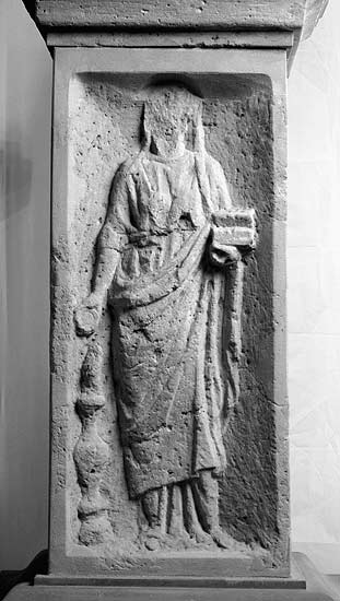Auf den Nebenseiten mythische Figuren in Rechtecknischen. Links frontal stehende Juno in Chiton und über den Kopf gezogenem Mantel, in der Linken geöffnetes Weihrauchkästchen, die Rechte hält eine Schale über einen balusterförmigen Altar.