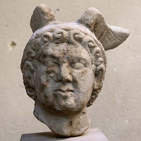 - Mythische Figur: Kopf des Mercur mit Spirallocken um die Stirn und Kappe mit Flügeln.