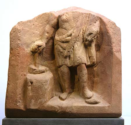 - Mythische Figur : stehender Vulcanus in kurzem Chiton, rechte Schulter entblößt, die Rechte auf dem auf dem Amboss abgestützten Hammer.