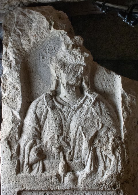 - In Bogennische Brustbild einer einheimischen Frau mit Schleier, Gürtel, Fibeln, Torques, in der Rechten Spindel. Zwischenbild mit Wagenszene: vierrädriger offener Wagen mit Kutscher und Zweigespann.