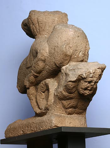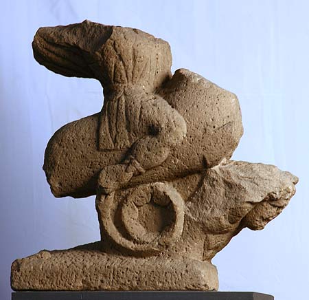 - Mythische Figuren : über sich aufbäumenden Giganten hineg reitender Jupiter in kurzer gegürteter Tunica, Mantel und Stiefeln.