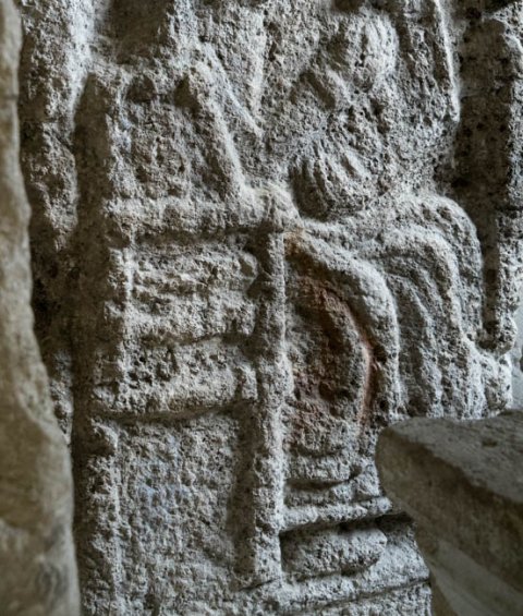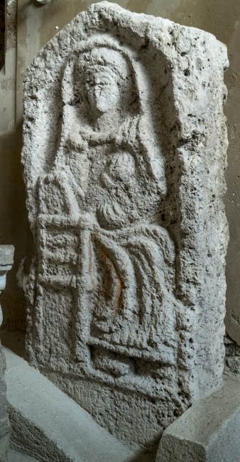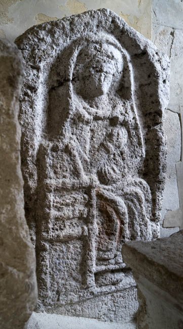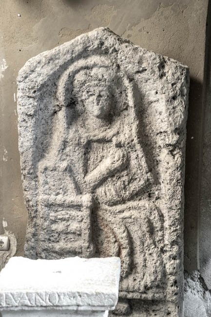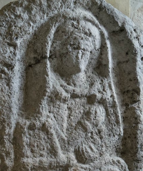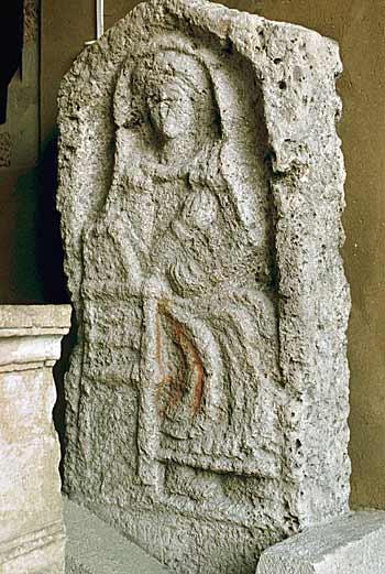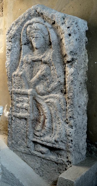 - Einheimische Frau. In Bogennische Ganzfigur auf Lehnstuhl. Haube, Schleier, Ober- und Untergewand, Fibeln, Torques, Armreifen, in der Linken Frucht ?