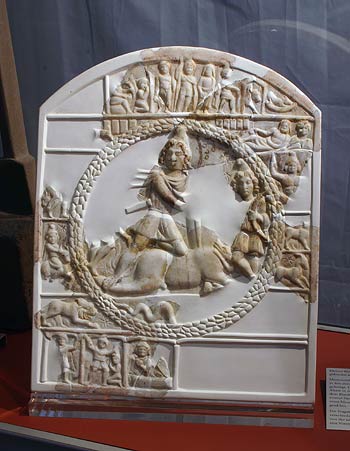 - Mythos (Mithras): rechteckige Tafel mit flachem Bogenabschluss. Im Zentrum rundes Bildfeld mit Kranzrahmen, darin Stiertötung (Tauroktonie), darunter und seitlich kleine gerahmte Felder mit Szenen der Mithraslegende und Tieren, im Bogenfeld stehende Götter.