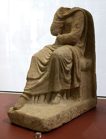 - Frau (Göttin ?): auf kastenförmigem Thron mit hoher Rückenlehne und Polster sitzende, ganz in den Mantel gehüllte Frau, rechter Ellbogen lag auf linker Hand, der Kopf war auf die rechte Hand gestützt.