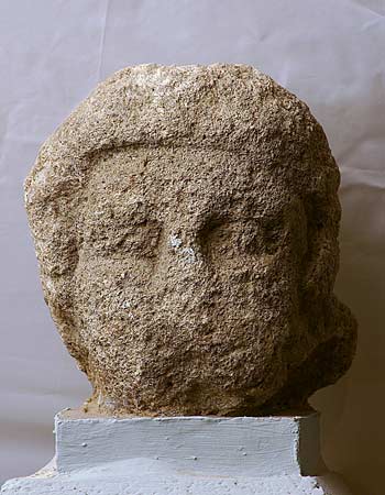 - stark verwittert, Kinn, Mund und Nase abgeschlagen
