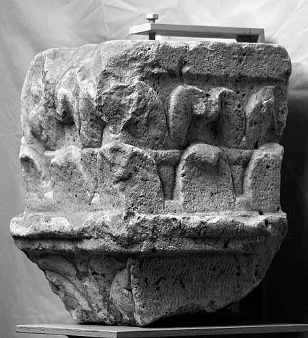 - An drei Seiten bearbeitetes viersseitiges Blattkapitell, unterhalb des profilierten Abakus Ansatz des Pyramidenstumpfes mit reliefierter Vorderseite.