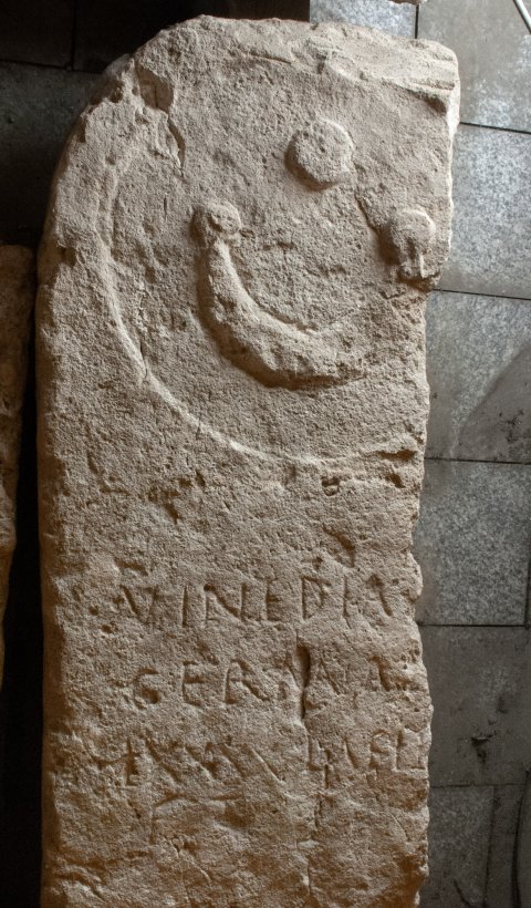 - oberhalb der Inschrift Mondsichel, Sonnenscheibe
