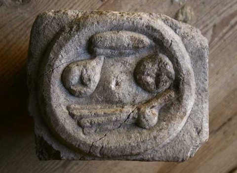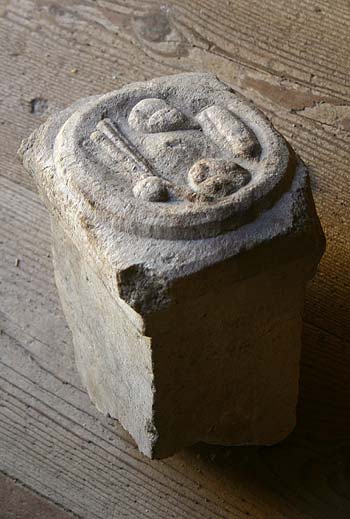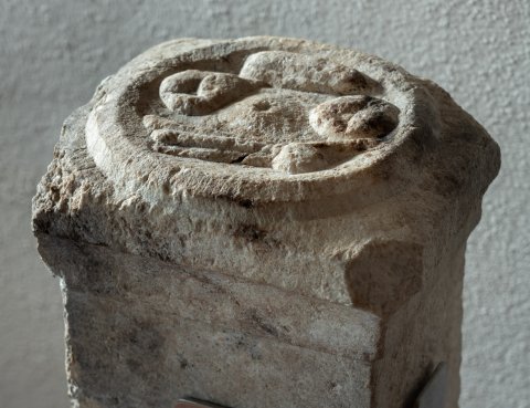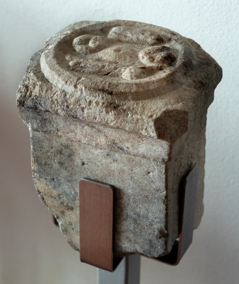 - Auf der Oberseite des Altars Omphalos-Schale mit Früchten.
