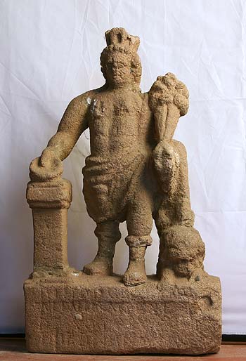 - Mythische Figur: stehender Genius mit Mauerkrone, Mantel um Hüften und linken Arm, Stiefeln. Im linken Arm Füllhorn, die Rechte leert eine Schale über einem Altar. Neben dem linken Fuß liegender Löwe.