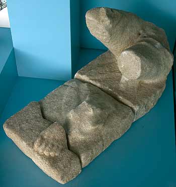 - Mythische Figur (?) : auf rechteckiger Basis nach rechts hin gelagerter Mann, Mantelrest auf dem linken Oberschenkel. Brunnenfigur ?