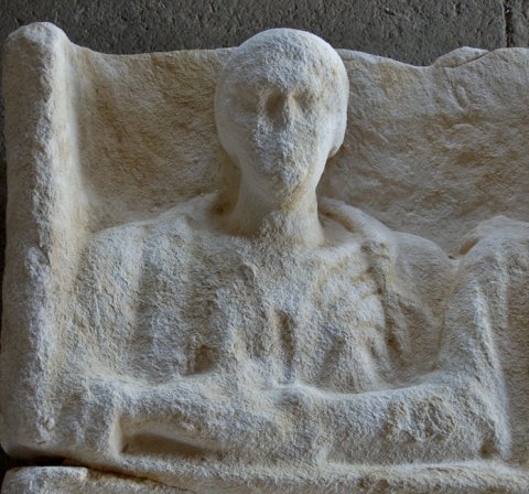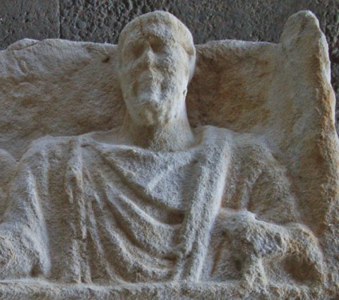 - Über einem gerahmten leeren Schriftfeld Nische mit zwei Brustbildern (Ehepaar) : links einheimische Frau mit Haube und Umhang. Rechts bärtiger Mann in Ärmeltunica und Sagum mit Scheibenfibel, in der Linken Rolle (volumen).