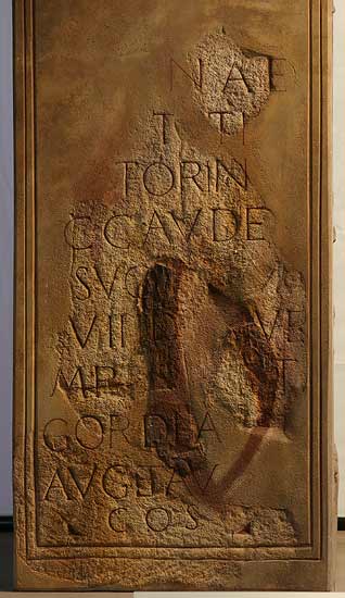 - [I(ovi) O(ptimo) M(aximo)] / [et Iun]o[ni] / [Regi]nae / [---]t[--]ti[us] / [Vi]ctorin[us] / [de]c(urio) c(ivitatis) Aude[r(iensium)] / in suo [ex] v[o]to / [a(nte) d(iem)] VII Id(us) [No]ve(mbres) / [I]mp(eratore) d(omino) n(ostro) [M(arco) An]t(onio) / Gordia[no] / Aug(usto) et Av[iola] / co(n)s(ulibus)