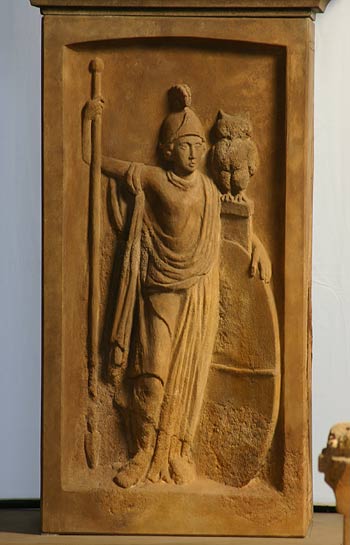 Auf den Nebenseiten mythische Figuren. Links Minerva (wenige Reste der Eule, des Schildes, der Lanze sowie der Füße erhalten). Stehende Minerva, die Rechte auf die Lanze, die Linke auf den Schild gestützt, neben der linken Schulter Eule.