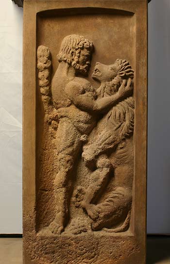 Auf der Rückseite Mythos : nackter Hercules, Keule auf dem Rücken, im Ringkampf mit dem aufgerichteten Löwen. - Inschrift
