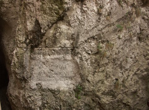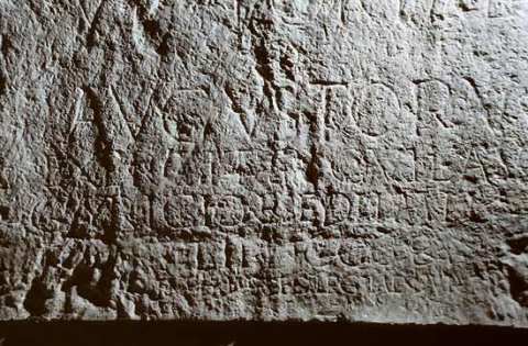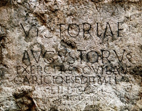 - Victoriae / Augustoru(m) / exercitus cui (= qui) Lau/garicione sedit mil(ites) / l(egionis) II DCCCLV / [ M(arcus) Val(erius) Maximi]anus leg(atus) leg(ionis) II Ad(iutricis) cur(avit)