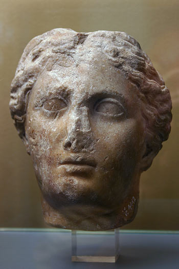 - Mythische Figur (Göttin, Diana ?) : leicht zur linken Schulter geneigter Frauenkopf.