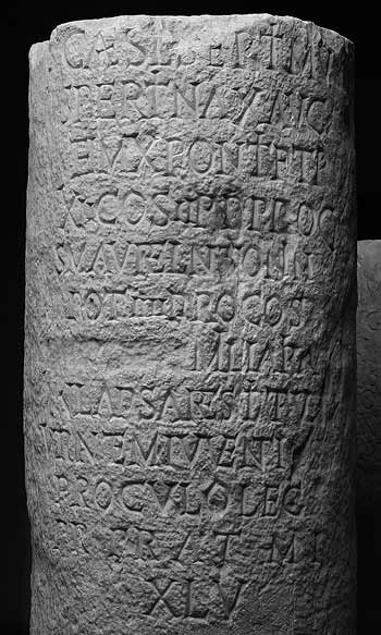 - [ Im]p(erator) Caes(ar) L(ucius) Septimiu[s Severus / Pi]us Pertinax Auc(ustus) (!) A[rab(icus) Adiab(enicus) / Par]thi(cus) max(imus) pontif(ex) tr(ibunicia) p[ot(estate) VIIII / imp(erator) ] XII co(n)s(ul) II p(ater) p(atriae) proc[o(n)s(ul) et Imp(erator) ] / Caes(ar) M(arcus) Aurel(ius) Antoninu[s Pius Aug(ustus) / tri(unicia) ] pot(estate) IIII proco(n)s(ul) e[t P(ublius) Sept(imius) / [ Geta nob(ilissimus) Caes(ar) ] miliaria [ vetustate / c]onlapsa restituer[unt] / curante M(arco) Iuventi[o Suro ] / Proculo leg(ato) / pr(o) pr(aetore) a T(eurnia m(ilia) p(assuum) / XLV