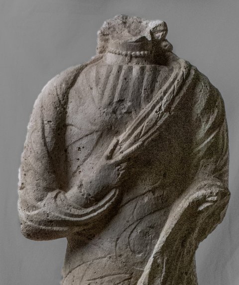 - Auf einem Podest stehende Frau: Tunica, Mantel mit Borte, Halskette, Haar fällt bis auf die Schulter. Die Rückseite der Statue ist ausgearbeitet.