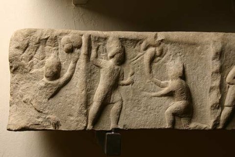 Vier Rechteckfelder. Von links: a) Mithras mit phrygischer Mütze, streckt in geduckter Haltung die linke Hand nach Früchten eines Baumes empor.