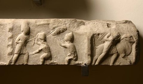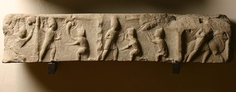 - Im Bäcker Gerockschen Haus eingemauert. Wahrscheinlich vom Mithräum des Lagers Walheim.