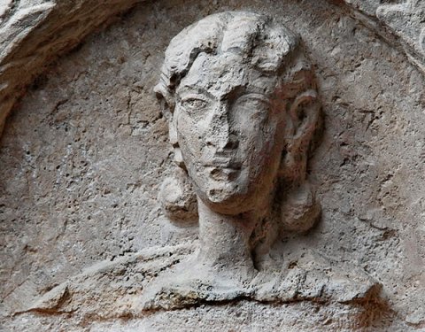 Im Hauptbild zwischen Säulen Lorbeerkranz mit Clipeus. Darin Brustbild einer Frau mit severischer Frisur und Ohrgehängen.