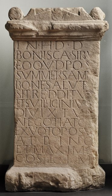 - In h(onorem) d(omus) d(ivinae) / bonis Cassibu[s] / eo quod pos[t] / summersam{m} / bon(a)e salut[i] / sit redditu[sd; / et sui(s) L(ucius) Licinius / Divixtus / negotiato[r] / ex voto posu(it) / A<l=B>bino / et Maximo / co(n)s(ulibus) l(ibens) l(aetus) m(erito)